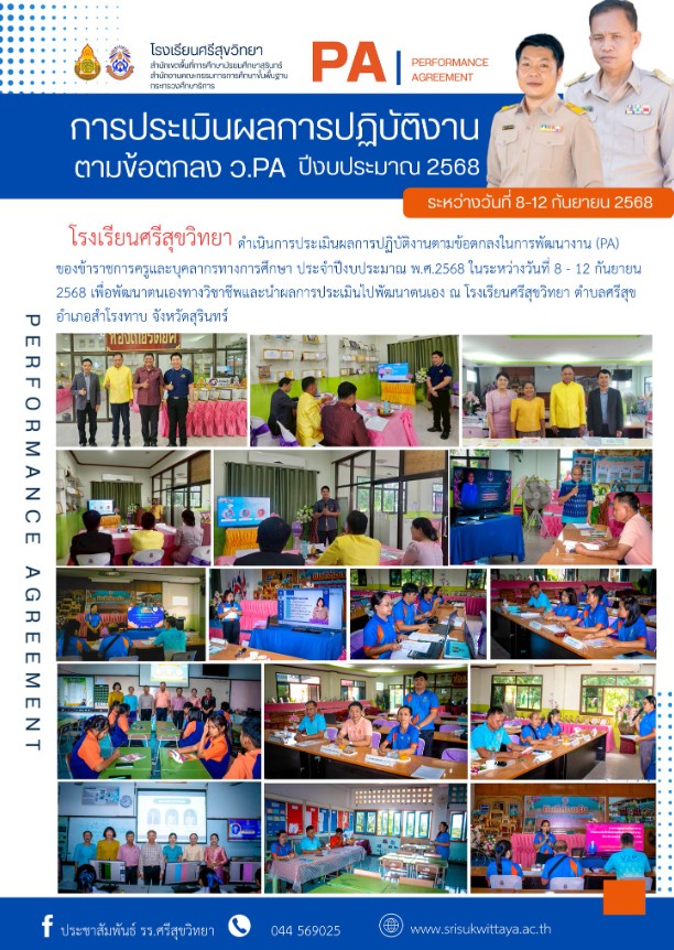 | โรงเรียนศรีสุขวิทยา ดำเนินการประเมินผลการปฏิบัติงานตามข้อตกลงในการพัฒนางาน (PA) ของข้าราชการครูและบุคลากรทางการศึกษา ประจำปีงบประมาณ พ.ศ.2568 ในระหว่างวันที่ 8 - 12 กันยายน 2568 เพื่อพัฒนาตนเองทางวิชาชีพและนำผลการประเมินไปพัฒนาตนเอง ณ โรงเรียนศรีสุขวิทยา ตำบลศรีสุข อำเภอสำโรงทาบ จังหวัดสุรินทร์ |