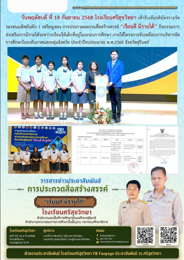 | วันพฤหัสบดี ที่ 18 กันยายน 2568 โรงเรียนศรีสุขวิทยา เข้ารับเกียรติบัตรรางวัลรองชนะเลิศอันดับ 1 เหรียญทอง การประกวดผลงานสื่อสร้างสรรค์ “เรียนดี มีรายได้” กิจกรรมการส่งเสริมการมีรายได้ระหว่างเรียนให้เด็กที่อยู่ในระบบการศึกษา ภายใต้โครงการขับเคลื่อนการบริหารจัดการศึกษาในระดับภาคและกลุ่มจังหวัด ประจำปีงบประมาณ พ.ศ.2568 จังหวัดสุรินทร์ |