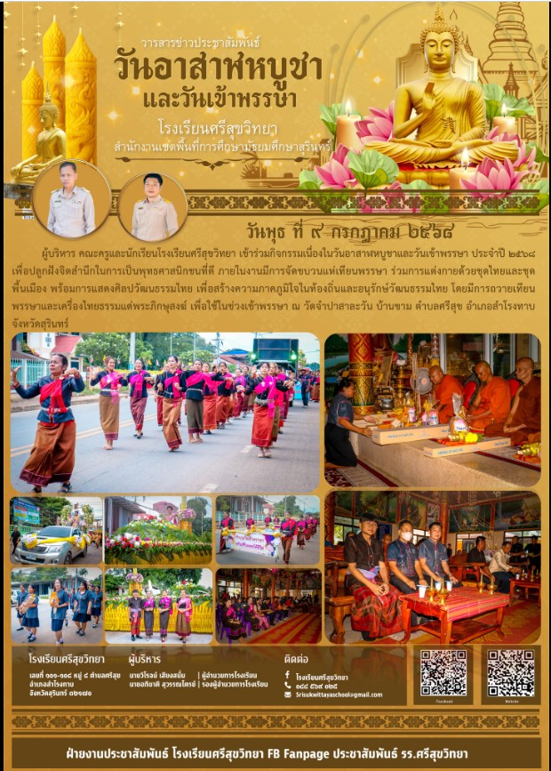 ผู้บริหาร คณะครูและนักเรียนโรงเรียนศรีสุขวิทยา เข้าร่วมกิจกรรมเนื่องในวันอาสาฬหบูชาและวันเข้าพรรษา ประจำปี ๒๕๖๘ เพื่อปลูกฝังจิตสำนึกในการเป็นพุทธศาสนิกชนที่ดี ภายในงานมีการจัดขบวนแห่เทียนพรรษา ร่วมการแต่งกายด้วยชุดไทยและชุดพื้นเมือง พร้อมการแสดงศิลปวัฒนธรรมไทย เพื่อสร้างความภาคภูมิใจในท้องถิ่นและอนุรักษ์วัฒนธรรมไทย โดยมีการถวายเทียนพรรษาและเครื่องไทยธรรมแด่พระภิกษุสงฆ์ เพื่อใช้ในช่วงเข้าพรรษา ณ วัดจำปาสาละวัน บ้านขาม ตำบลศรีสุข อำเภอสำโรงทาบ จังหวัดสุรินทร์ |