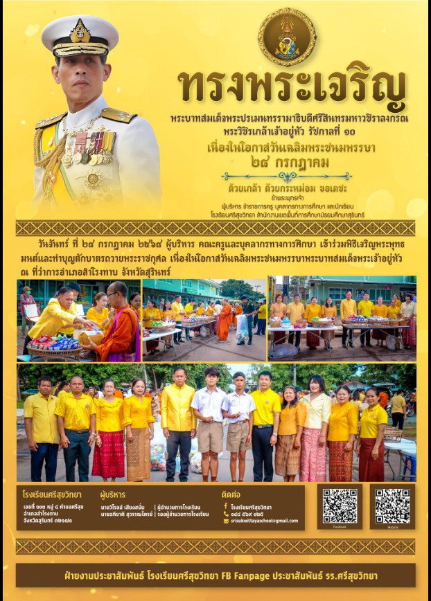วันจันทร์ ที่ ๒๘ กรกฎาคม ๒๕๖๘ ผู้บริหาร คณะครูและบุคลากรทางการศึกษา เข้าร่วมพิธีเจริญพระพุทธมนต์และทำบุญตักบาตรถวายพระราชกุศล เนื่องในโอกาสวันเฉลิมพระชนมพรรษาพระบาทสมเด็จพระเจ้าอยู่หัว