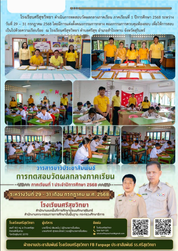 | โรงเรียนศรีสุขวิทยา ดำเนินการทดสอบวัดผลกลางภาคเรียน ภาคเรียนที่ 1 ปีการศึกษา 2568 ระหว่างวันที่ 29 – 31 กรกฎาคม 2568 โดยมีการแต่งตั้งคณะกรรมการกลาง คณะกรรมการควบคุมห้องสอบ เพื่อให้การสอบเป็นไปด้วยความเรียบร้อย ณ โรงเรียนศรีสุขวิทยา ตำบลศรีสุข อำเภอสำโรงทาบ จังหวัดสุรินทร์ |