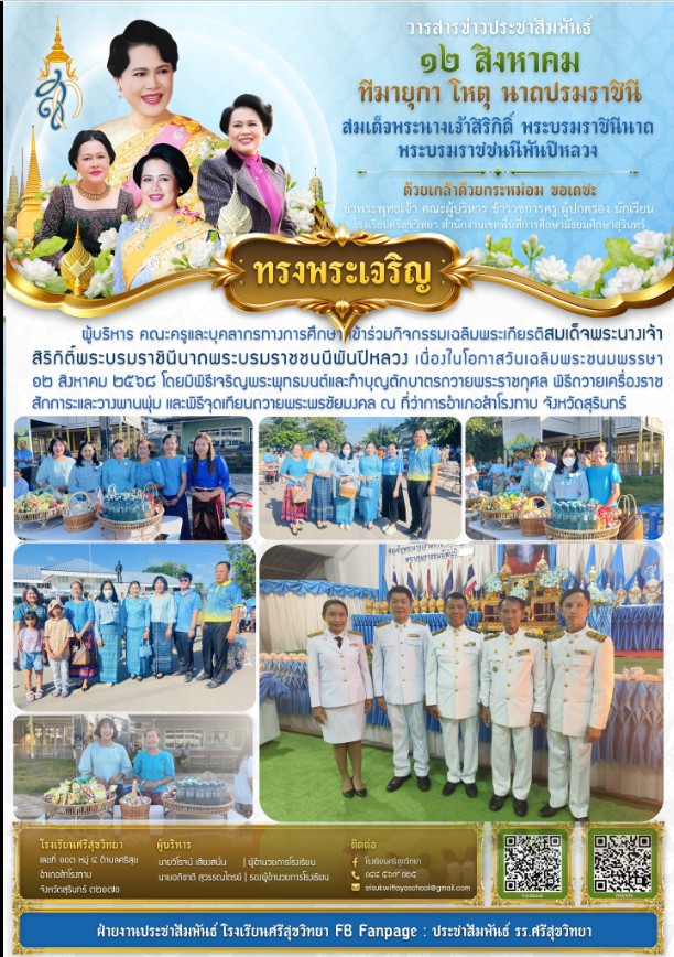 | ผู้บริหาร คณะครูและบุคลากรทางการศึกษา เข้าร่วมกิจกรรมเฉลิมพระเกียรติสมเด็จพระนางเจ้าสิริกิติ์พระบรมราชินีนาถพระบรมราชชนนีพันปีหลวง เนื่องในโอกาสวันเฉลิมพระชนมพรรษา ๑๒ สิงหาคม ๒๕๖๘ โดยมีพิธีเจริญพระพุทธมนต์และทำบุญตักบาตรถวายพระราชกุศล พิธีถวายเครื่องราชสักการะและวางพานพุ่ม และพิธีจุดเทียนถวายพระพรชัยมงคล ณ ที่ว่าการอำเภอสำโรงทาบ จังหวัดสุรินทร์ |