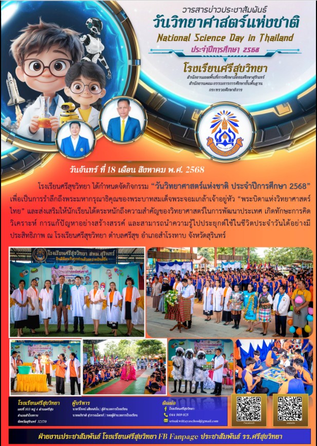 โรงเรียนศรีสุขวิทยา ได้กำหนดจัดกิจกรรม “วันวิทยาศาสตร์แห่งชาติ ประจำปีการศึกษา 2568”เพื่อเป็นการรำลึกถึงพระมหากรุณาธิคุณของพระบาทสมเด็จพระจอมเกล้าเจ้าอยู่หัว “พระบิดาแห่งวิทยาศาสตร์ไทย” และส่งเสริมให้นักเรียนได้ตระหนักถึงความสำคัญของวิทยาศาสตร์ในการพัฒนาประเทศ เกิดทักษะการคิดวิเคราะห์ การแก้ปัญหาอย่างสร้างสรรค์ และสามารถนำความรู้ไปประยุกต์ใช้ในชีวิตประจำวันได้อย่างมีประสิทธิภาพ ณ โรงเรียนศรีสุขวิทยา ตำบลศรีสุข อำเภอสำโรงทาบ จังหวัดสุรินทร์