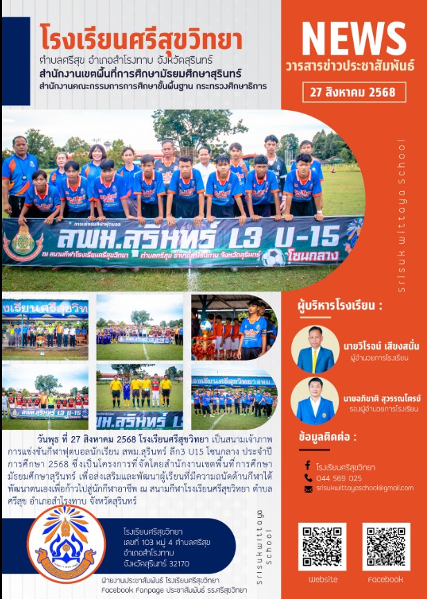 | วันพุธ ที่ 27 สิงหาคม 2568 โรงเรียนศรีสุขวิทยา เป็นสนามเจ้าภาพการแข่งขันกีฬาฟุตบอลนักเรียน สพม.สุรินทร์ ลีก3 U15 โซนกลาง ประจำปีการศึกษา 2568 ซึ่งเป็นโครงการที่จัดโดยสำนักงานเขตพื้นที่การศึกษามัธยมศึกษาสุรินทร์ เพื่อส่งเสริมและพัฒนาผู้เรียนที่มีความถนัดด้านกีฬาได้พัฒนาตนเองเพื่อก้าวไปสู่นักกีฬาอาชีพ ณ สนามกีฬาโรงเรียนศรีสุขวิทยา ตำบลศรีสุข อำเภอสำโรงทาบ จังหวัดสุรินทร์ |